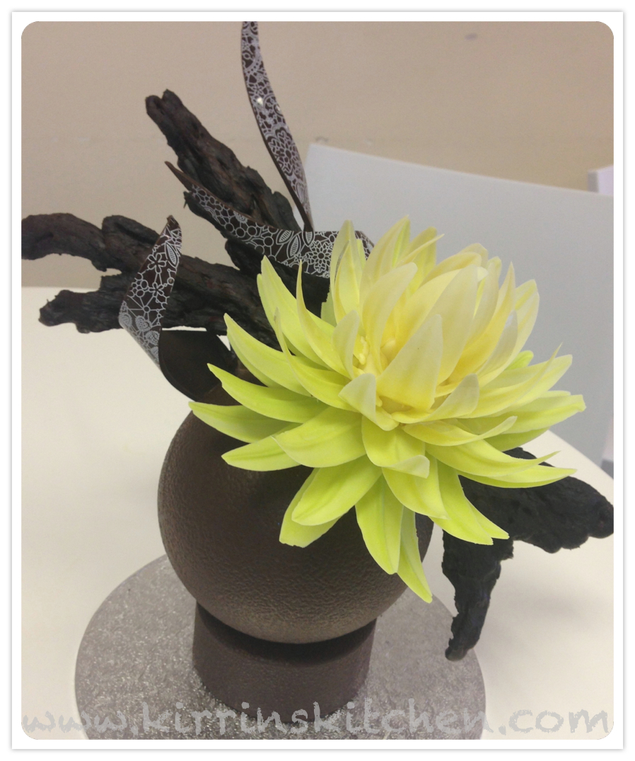 Next we made petals for what was to become a chocolate flower. This was quite satisfying. I’ve done a lot of work with sugar flowers for my “Kirrin’s Cakes” but never in chocolate before. It was genius, just by dipping a small pointed knife in melted chocolate and transferring it to a strip of acetate, each petal only took a few seconds. The catch was working quickly enough to make all your petals before the chocolate set too much, and then being careful not to re-warm it too much and de-temper it… not admitting for a second that I did that at all.
