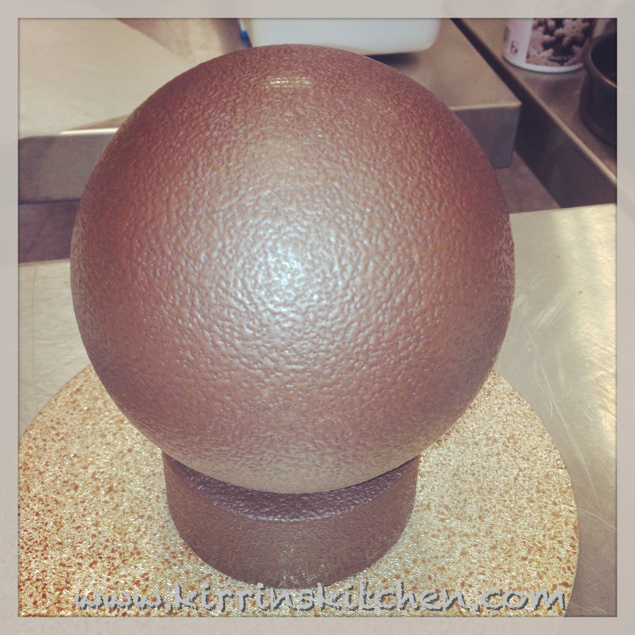Today we turned our two hemispheres into a giant sphere, like an enormous hollow malteser. We mounted it on a solid chocolate plinth (about the size of an ice hockey puck) and airbrushed the whole thing with a chocolate and cocoa butter mix.